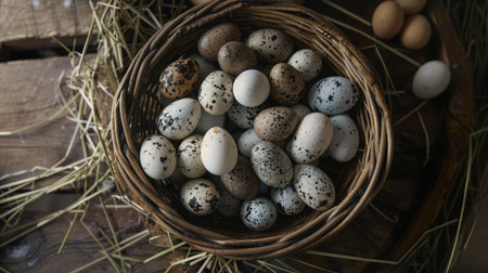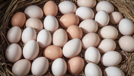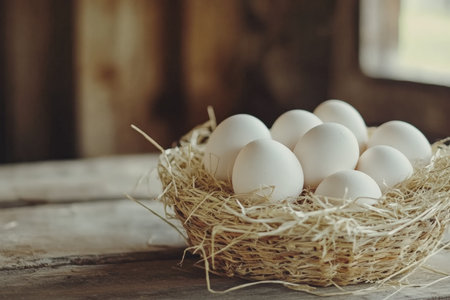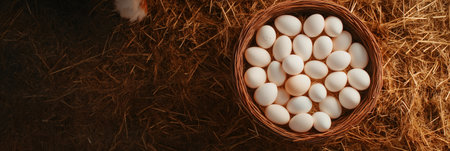 Basket overflowing with fresh organic white eggs resting on a bed of hay inside a chicken coop, showcasing the essence of farm fresh goodness and promoting healthy eating