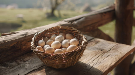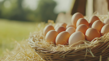 Freshly harvested eggs neatly arranged in a rustic basket surrounded by straw at a sunny farm
