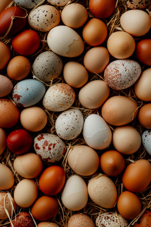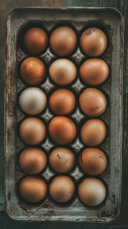 A visually appealing assortment of fresh farm eggs arranged in a rustic carton, showcasing their varied textures and colors, ideal for culinary visuals.