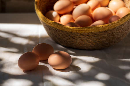 Hen / Fresh chicken eggs on basket. Nutrition concept, Selective focus.