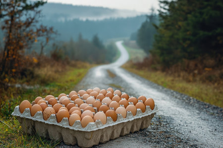A Fresh eggs on carton along rural road, showcasing farm to table delivery