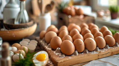 A collection of fresh organic eggs sits neatly in cartons on a rustic wooden table, capturing the essence of farm life and natural food production.