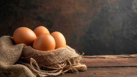A serene still-life featuring fresh brown eggs nestled in a rustic carton, draped with a textured cloth on a weathered wooden table, evoking warmth and simplicity.