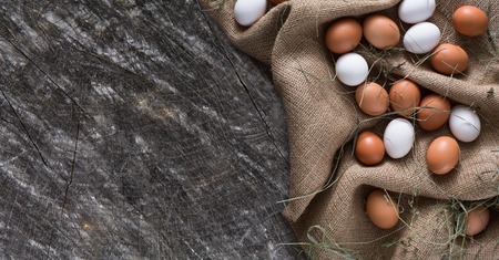 Poultry farm concept. Fresh brown and white eggs on burlap textile at brown wood background with copy space. Top view on sacking. Rural still life, natural organic healthy food.
