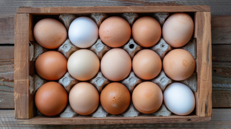 A visually appealing arrangement of fresh farm eggs in a wooden crate showcases various colors and textures, perfect for culinary creations or farm-themed decor.