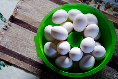 assorted white eggs grouped in green bowl on table and soft side lighting