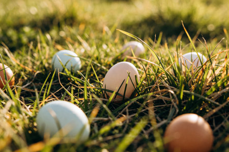 A collection of various colored eggs are scattered amongst blades of green grass, bathed in soft, golden sunlight