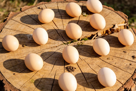 Fresh Rooster Eggs on top view on wood table at Local Farmer Market