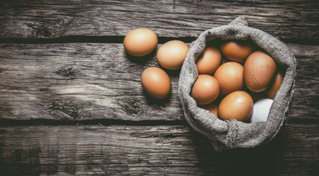 Eggs with an old bag. On a wooden table. Free space for text . Top view