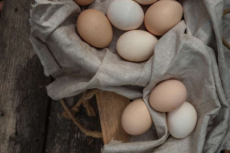 fresh natural organic eggs wooden table background Food Rustic Still Life sack bag wicker basket chicken feathers linen napkin countryside Investment Concept easter space text Top view hey