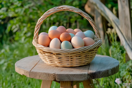 A woven basket filled with a variety of colorful eggs sits on a wooden table surrounded by vibrant greenery. The tranquil garden setting evokes a peaceful, countryside atmosphere.