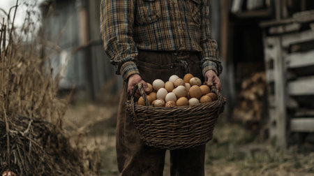Farmer's hands gently holding a nest of fresh eggs, emphasizing the care and attention in poultry farming.