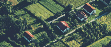 rural landscape from a bird's eye view with rural houses and fields.