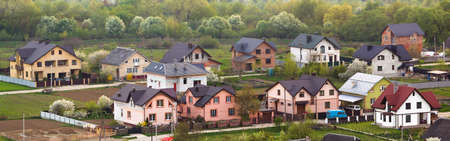 Panoramic image of private houses with lots of green trees and bushes