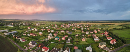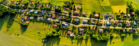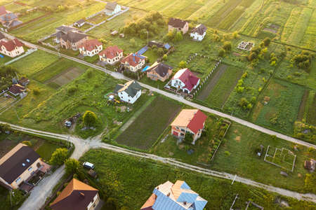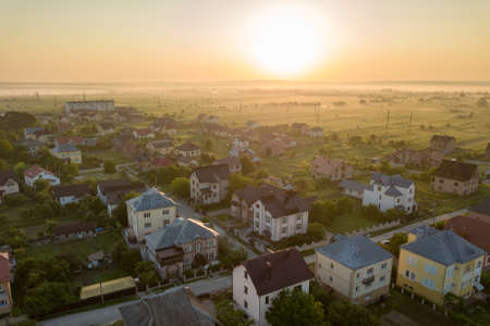 Aerial view of rural residential area with private homes between green fields at sunrise.