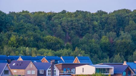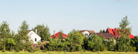 Quiet residential suburban area. Street with new modern comfortable brick cottages with yards and blooming gardens on background of beautiful green forest. Investments in real estate concept.