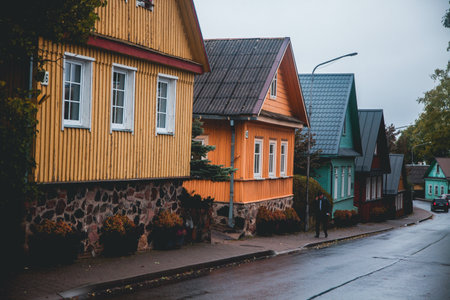 Trakai, Lithuania - April 10 2021: Old Lithuanian traditional green wooden houses with three windows in Trakai, Vilnius district, Lithuania, Europe