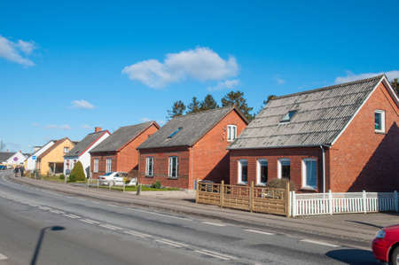 bright single-storey brick houses stand along the road in the village on a summer day