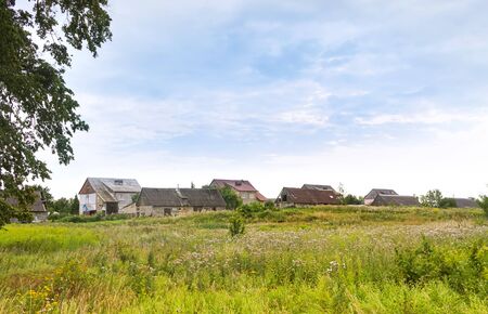 Typical old salas in Vojvodina, a traditional type of property in the Pannonian Plain region, with family house and agricultural objects, surrounded by arable land and pastures, selective focus