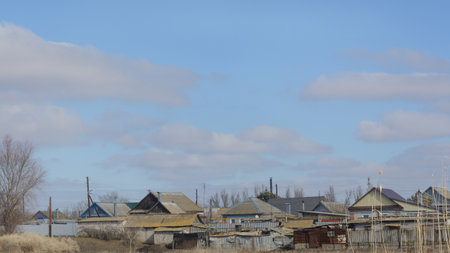 Village in early spring. Beautiful sky and houses on outskirts. Wide format, panoramic rural landscape.