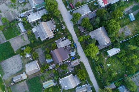 Top view of the village. The village of Poltavskaya. Top view of the village. One can see the roofs of the houses and gardens. Village bird eye view.