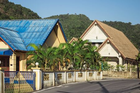 Panoramic landscape of houses surrounded by trees with background of evening sky. Colorful asian houses. Langkawi island, Malaysia.