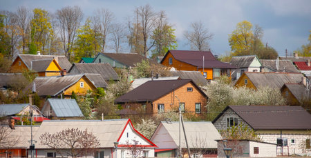 Colorful houses nestled among blooming trees create a picturesque spring landscape under a cloudy sky in a rural setting.
