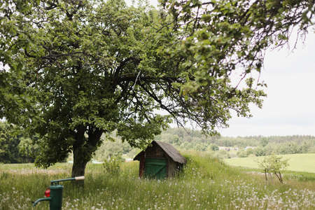 Small wooden house in rural field, view on a farmhouse in countryside, summer scenic landscape.