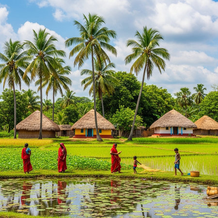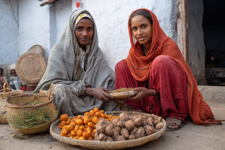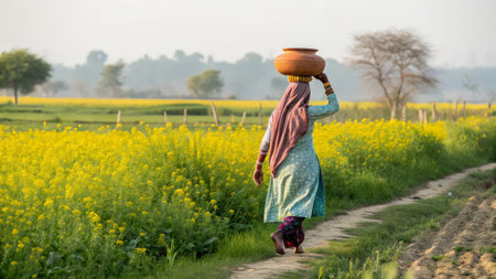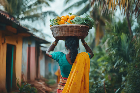 Rural woman walking through a village, balancing a basket filled with fresh vegetables and fruits on her head, representing daily life and food supply