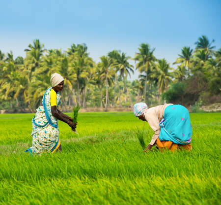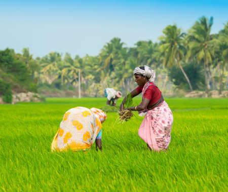THANJAVOUR, INDIA - FEBRUARY 13: An unidentified the Indian rural women and man works at rice field. India, Tamil Nadu, near Thanjavour. February 13, 2013