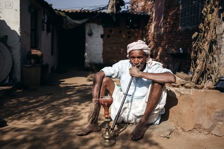 RAJASTHAN, INDIA - JANUARY 9, 2015: Old Indian man smoking hookah on January 9, 2015 in Rajasthan, India