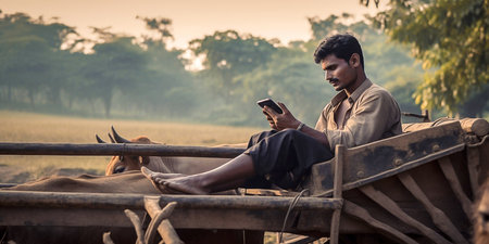 Depicts a scene in which an Indian uses a mobile phone while lying on a wooden cart surrounded by cattle. Represents the fusion of traditional and modern elements in India.