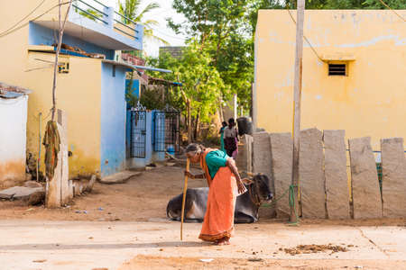 PUTTAPARTHI, ANDHRA PRADESH, INDIA - JULY 9, 2017: Elderly woman on a rural street.