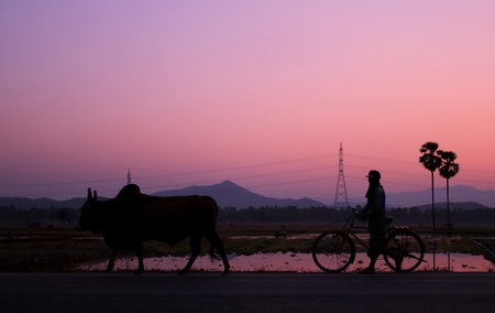 MADURAI, INDIA - FEBRUARY 17: An unidentified man on a rural road on a bicycle carries cane leaves. India, Tamil Nadu, near Madurai. February 17, 2013.