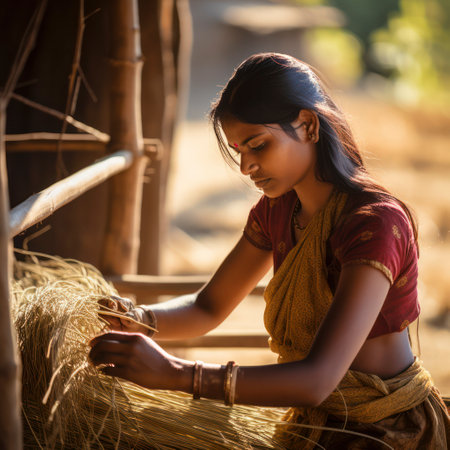 Indian young woman in a sari with a tray of harvested crops, against the backdrop of a village in the jungle.