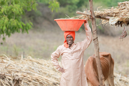 Indian farmer carrying the basket on her head, happy farmer, poor farm worker