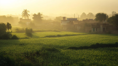 Morning mist over a traditional Punjabi village, golden sun casting a warm light over green fields generative ai