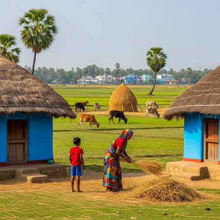 Deserted Indian Village: An empty rural village in India, with traditional mud huts, narrow lanes, and a quiet