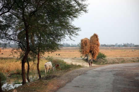 An unidentified farmer carries rice from the farm home on Dec 02, 2012 in Baidyapur, West Bengal, India This is the main shipping method farmers
