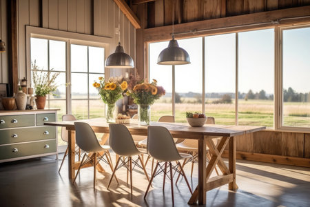 farmhouse with rustic wooden floor and modern dining table, created with generative ai