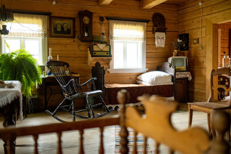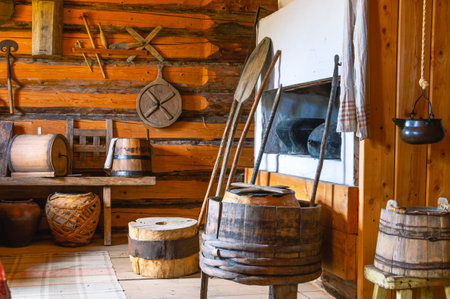 Samara region, Russia - May 11, 2019: Vintage wooden house utensils in rural home. Interior of the house museum of famous painter Ilya Repin in Shiryaevo village