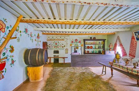 PEREIASLAV, UKRAINE - MAY 22, 2021: Interior of shynok tavern, decorated with floral patterns on the white walls, Pereiaslav Scansen, on May 22 in Pereiaslav