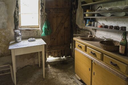 Bad Windsheim, Germany - 16 October 2019: Interior views of a german village house. View of an old, antique kitchen table with pots, plates and basket