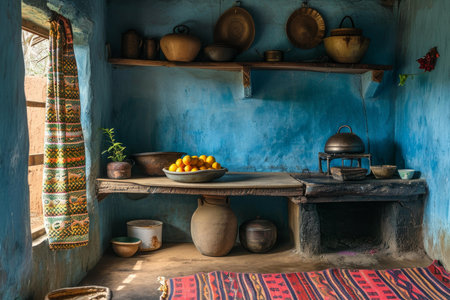 Cozy rural kitchen interior featuring earthenware, a wooden table, and a vintage stove