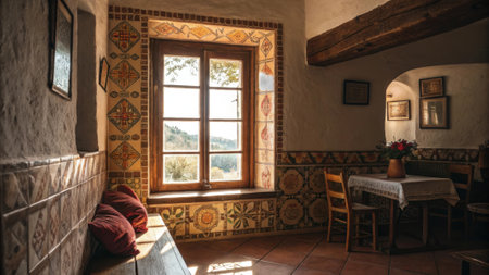 Natural light streams in through a small frosted window casting soft shadows and illuminating the rich hues of the tile adding warmth to the room..