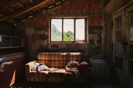 old abandoned house interior with broken furniture and empty windows. woodwork details in dust