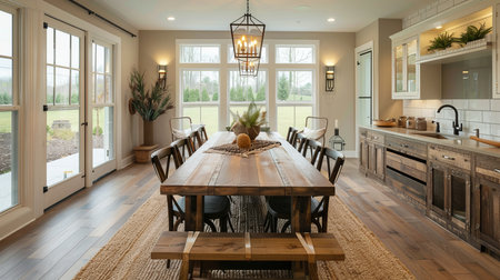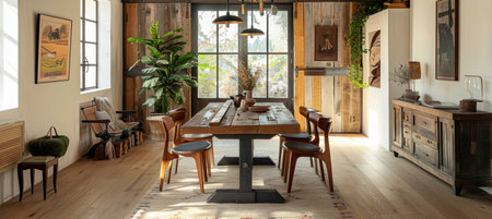 Interior design inspiration of Rustic Farmhouse style home dining room loveliness decorated with Wood and Metal material and Barn Doors .Generative AI home interior design .