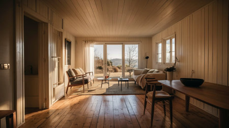 Cozy rustic living room with wooden doors and sunrise view. That the image is generated using AI.