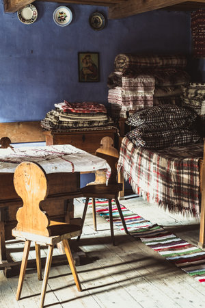 Sibiu city, Romania - August 17, 2019. Traditional Romanian folk house interior with rural furniture and decoration. Astra Museum of Traditional Folk Civilization, Sibiu