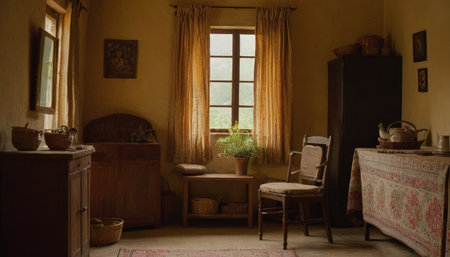A cozy kitchen scene featuring a rustic wooden table set with vintage dishware, bathed in warm sunlight streaming through a large window, creating a serene atmosphere.